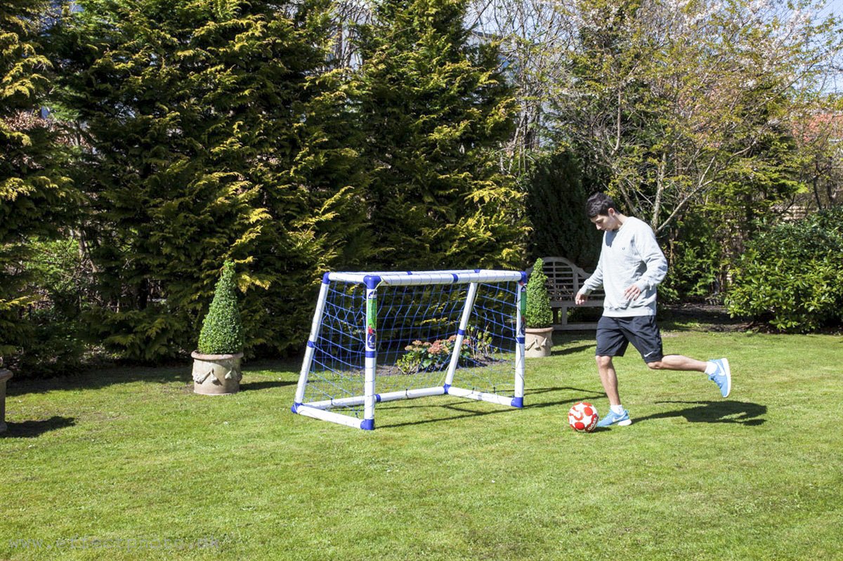 Småboldsmålet i solid plastkvalitet til sjov fodbold i haven eller klubben. Målet der bruges i mere end 200 klubber over hele landet. 150 x 100 x 82 cm med kraftig net. Fastgøres med medfølgende pløgger. Vægt 9,5 kg. Vejl.pris kr. 849.-