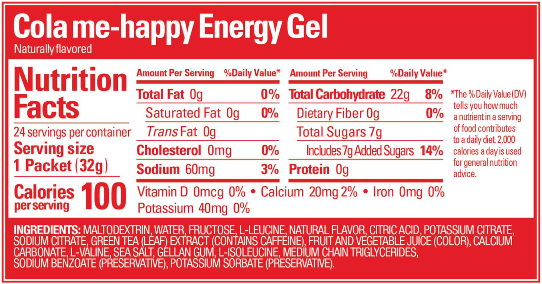 Energi Gel fra GU Energy Labs med smagsvarianten GU Energy Gel med Cola Me Happy med Koffein, unikke formler, fantastiske smagsvarianter og mavevenlige geler. GU energi gels sikrer alle, fra motionist til professionel en 100 kcal. Den er vegansk, glutenfri og kosher, hvilket imødekommer forskellige kostbehov. Hver portion leverer 100 kcal energi, sammen med essentielle næringsstoffer som elektrolytter og aminosyrer, for vedvarende styrke og udholdenhed.